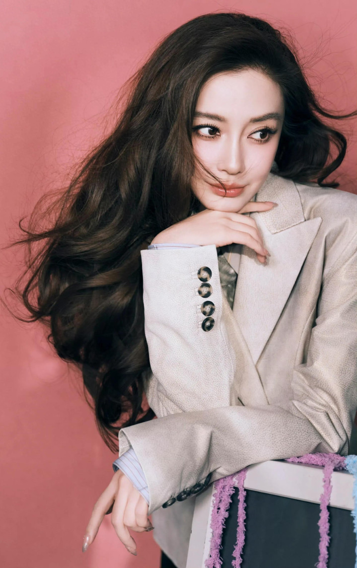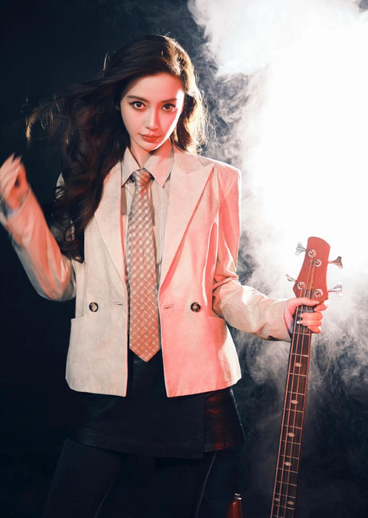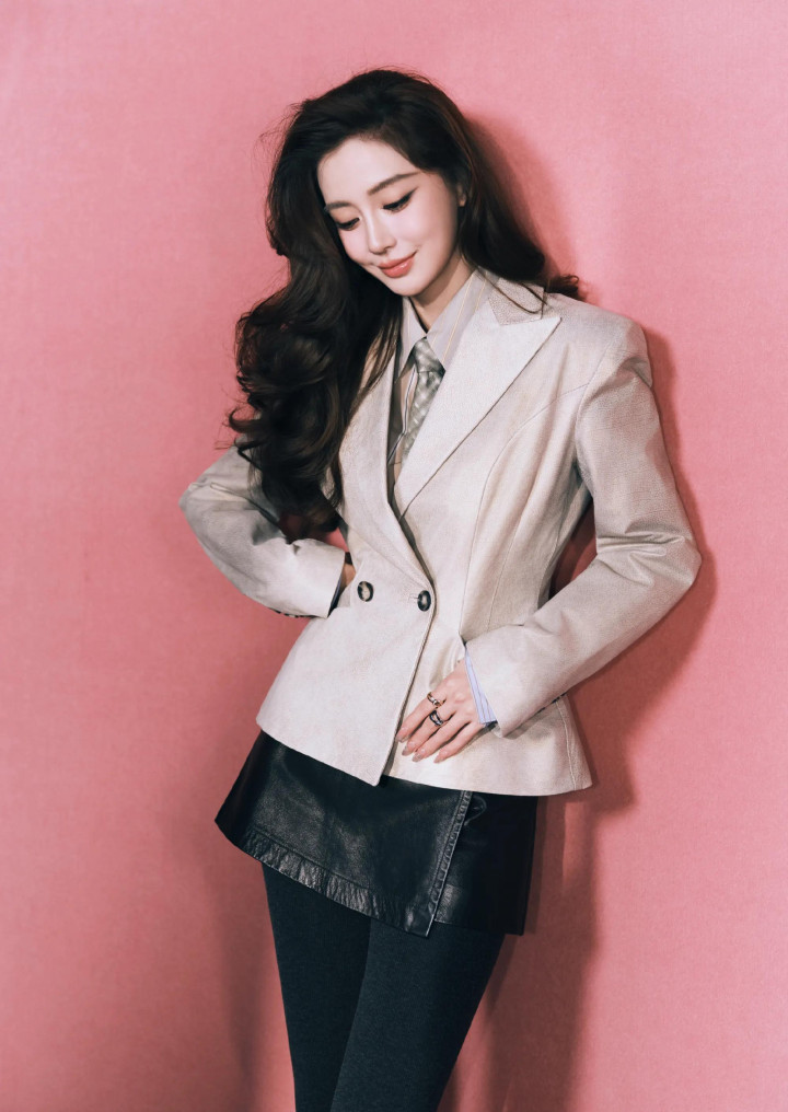 杨颖灰白色西装外套搭配黑色皮短裙,一头飘逸秀发妩媚动人,曼妙身姿性感十足,真是又美又飒!