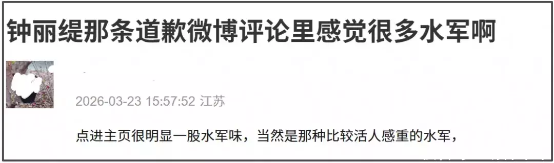 一眼望去,钟丽缇这篇道歉长文的评论区堪称大型水军洗白现场。这下子真看出是急了,连真实评论都不敢看了。可群众的眼睛是雪亮,即使是活人感十足的水军也依旧是水军,人机味儿太重了,也难怪网友直呼“买这么多水军”。