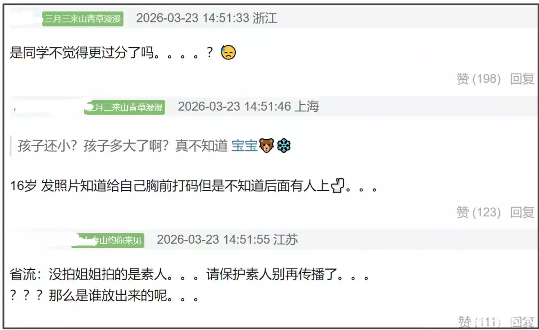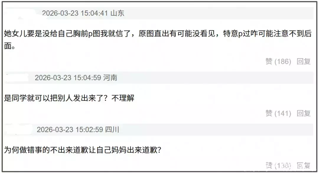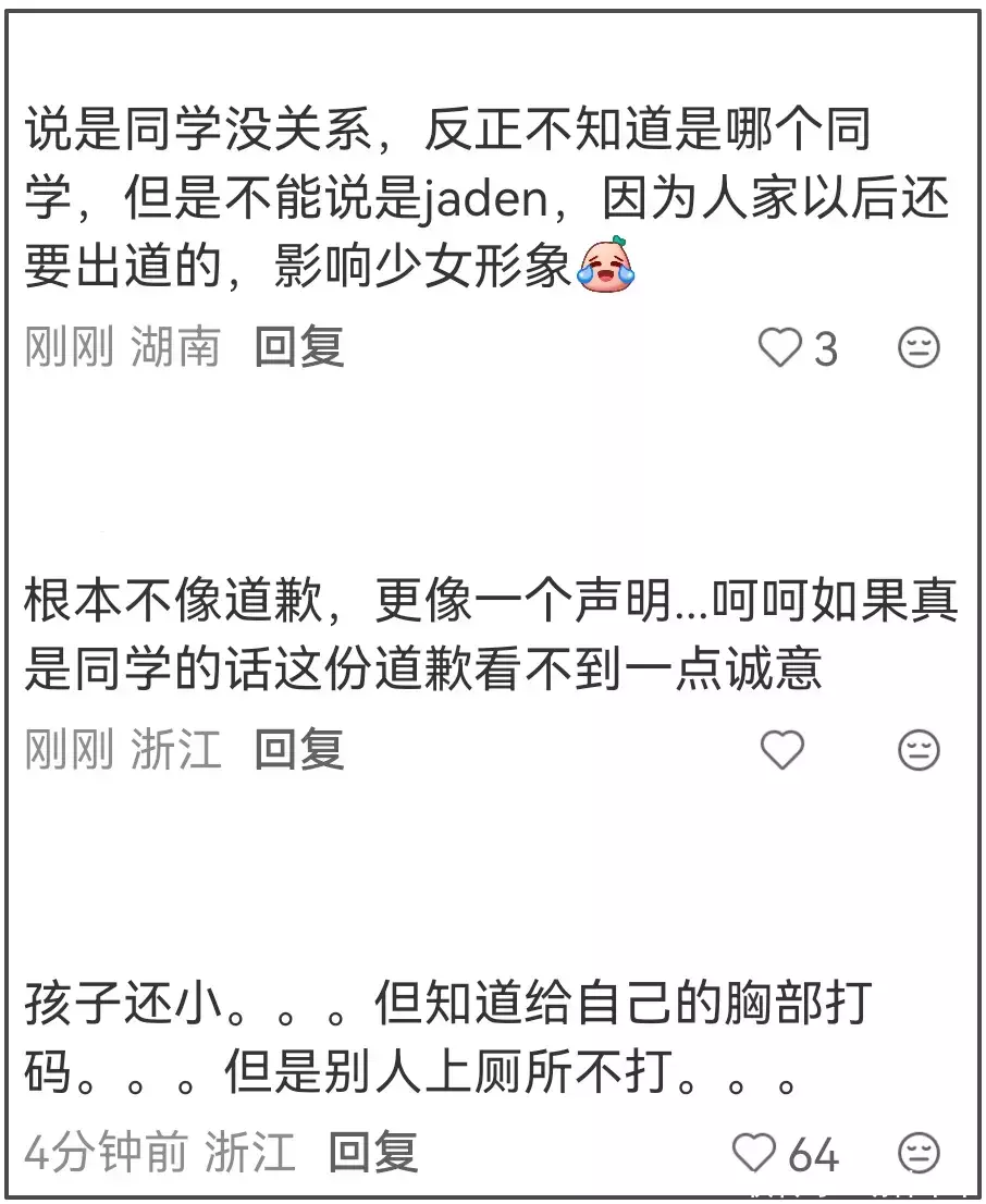 另外,钟丽缇文章中的那句“孩子还小”实在让人无语至极。考拉今年已经16岁了,实在称不上是一个孩子。更何况,钟丽缇口中的“没有意识到边界问题的孩子”记得将自己的胸前打码,却不记得给上厕所的同学打码。事情发展到现在,考拉还躲在妈妈身后,一声不吭,连个道歉都没有,着实让人愤慨。