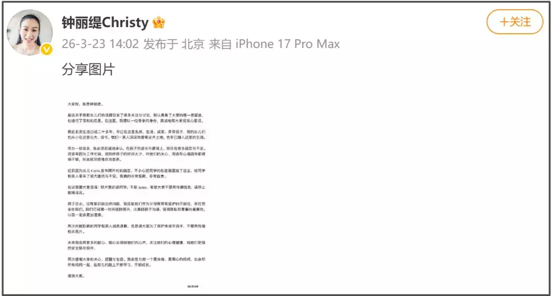 文章中,钟丽缇对背景中暴露隐私的同学只有一句轻描淡写的道歉。之后,她着重地澄清了一件事,那就是照片中暴露隐私的是同学,不是自己的二女儿Jaden。此前,有许多人猜测马桶上的女孩是考拉的姐姐,现在钟丽缇给出了正确答案,是同学。澄清之后就是推脱,一句“孩子还小”推脱了考拉身上的责任,之后又强调是父母教育和监护不到位。