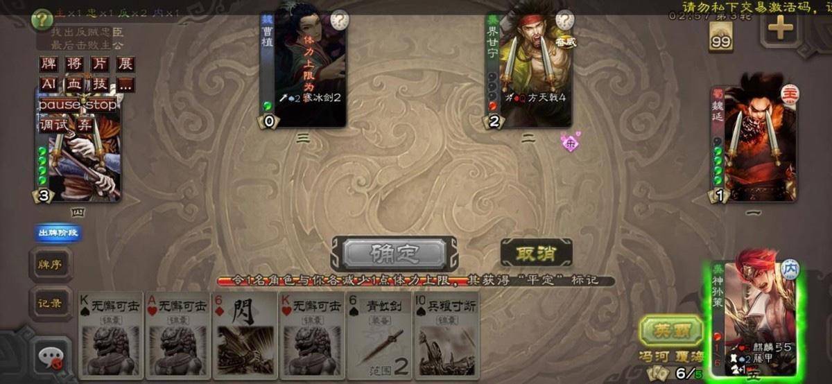 那么玩法确定了就知道什么时候放标记了,阶段是出牌阶段放就暗示了不要一上来就无脑先放标记,既然覆海只能让一张牌强中,那么这张牌最好的就是两张杀,先普通杀一下,然后再标记平定触发“使用牌无限制且无法响应”,那么第二张杀就无法闪避,最好可以喝个酒将伤害最大化。