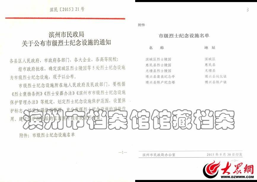本次公布的档案史料来源于滨州市档案馆馆藏滨州市民政局全宗,文件制发机关为滨州市民政局,文件形成时间为2015年9月30日,题名为《滨州市民政局关于公布市级烈士纪念设施的通知》。文件内容是滨州市民政局下发通知,公布滨城区烈士陵园等5处烈士纪念设施为市级烈士纪念设施。