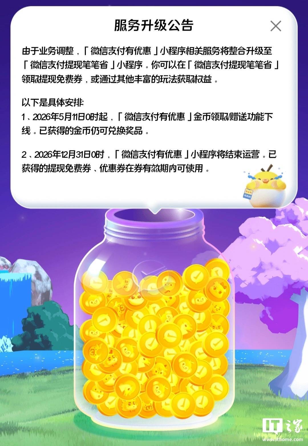 2、“微信支付有优惠”小程序将于 12 月 31 日结束运营,提现免费券有效期内仍可使用微信宣布「微信支付有优惠」小程序将于 2026 年 12 月 31 日结束运营,相关服务将整合升级至「微信支付提现笔笔省」小程序。5 月 1 日起金币领赠功能下线,但已获得的金币仍可兑换奖品,已领取的提现免费券在有效期内仍可使用。>> 查看详情